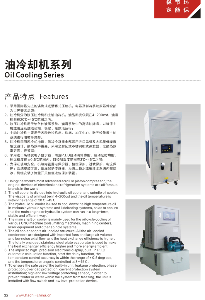 1、制冷能力是在環(huán)境溫度35℃,進(jìn)油溫度35℃,出油溫度30℃,油品為ISO VG32條件下測(cè)得。 2、用戶在選擇油冷機(jī)時(shí),必須選擇油液需控制的溫度范圍(1)18℃-25℃ (2)25℃-35℃ (3)35℃-45℃ (4)45℃以上。本公司推薦液壓油合理的溫度控制范圍為35℃-45℃. 3、油冷機(jī)吸油口必須用硬管連接,且加裝過濾器。 4、吸油管長度不應(yīng)超過1.5米,如超出必須加粗吸油口。 5、油冷機(jī)吸油口應(yīng)靠近設(shè)備回油口,出油口應(yīng)靠近設(shè)備供油口。 6、如吸油口太長,需將油泵與機(jī)組分離。 7、以上機(jī)組使用環(huán)境為5~42℃,42℃以上屬高溫機(jī)組,外形尺寸及相關(guān)參數(shù)會(huì)有所變更,請(qǐng)選型時(shí)注意。 8、參數(shù)表內(nèi)為本公司標(biāo)準(zhǔn)機(jī)型,本公司接受客戶特殊訂貨。 適用種類: ◇ CNC車床、銑床、磨床、拉床 ◇ CNC旋轉(zhuǎn)臺(tái)、油壓機(jī)、木工雕刻機(jī) ◇ CNC立式/臥式加工中心、綜合切削加工中心 ◇ 高速機(jī)械主軸、電主軸、靜壓(動(dòng)靜壓)主軸 ◇ 各種機(jī)械的液壓站及潤滑系統(tǒng) ◇ 放電加工設(shè)備.